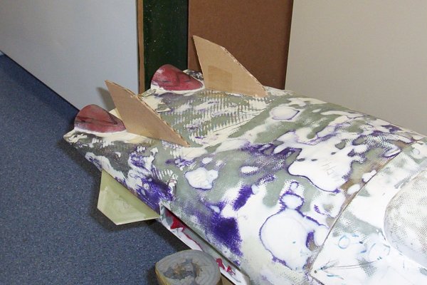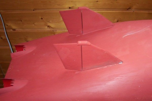 Das Bild ganz links zeigt dir damals ersten Versuche der Seitenruder. Ursprünglich sollten diese zwar an die Rumpfunterseite, aber auf der Oberseite können diese problemloser und vor allem größer gebaut werden.