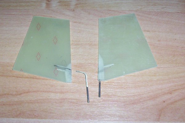 Die weiteren Bilder zeigen dann den Werdegang der finalen Version. Damit sich die Epoxy-Platten nicht durch die doch kräftigen Drehbewegungen von den Stahldräten lösen wurden die Drähte geknickt eingebaut. Im Inneren werden die Ruder dann durch ein einfaches Kugelgelenk angesteuert. Die Servos befinden sich dabei (im Gegensatz zu den Tiefenrudern) im inneren der Antriebsbox.